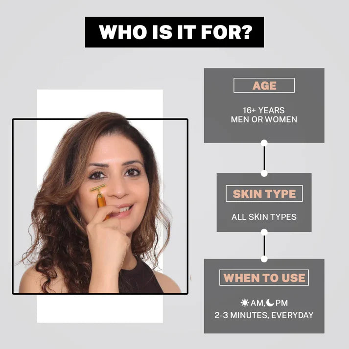 The T-shaped head is plated with pure 24K gold, known for its ion therapy benefits. It boosts collagen production, improves skin elasticity, and stimulates natural cell regeneration. The result? Smoother, firmer, radiant skin.
